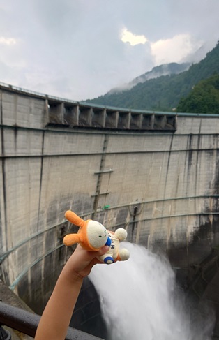 黒部ダム 夏休みの旅行で黒部ダムに行きました。子どもがえこぴょんを連れていってくれ、撮影にも協力。えこぴょんがダムの放水でウォータースライダーを楽しんでいます。