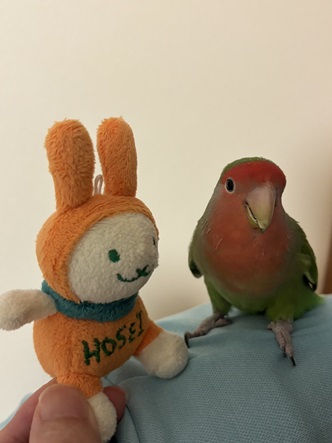 投稿者自宅 コザクラインコにえこぴょんと仲良くなってもらいたくて一緒に撮ってみました。