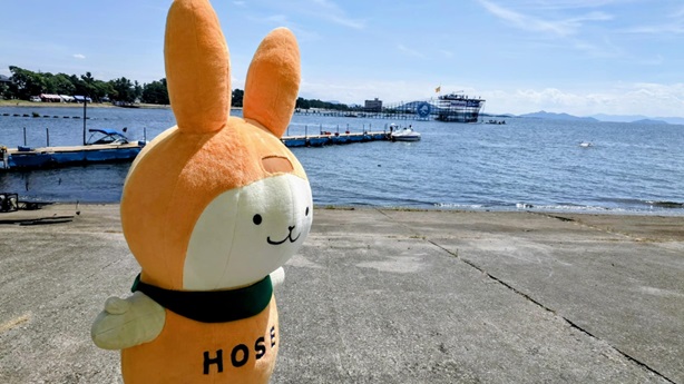 琵琶湖 息子が鳥人間コンテストサークル(航空工学研究会)に属しており、7月末その応援に琵琶湖へ行った際に、えこぴょんと一緒に応援しました。写真は飛行機が飛ぶプラットフォームをバックにしたえこぴょんです。猛暑日、暑かったです。